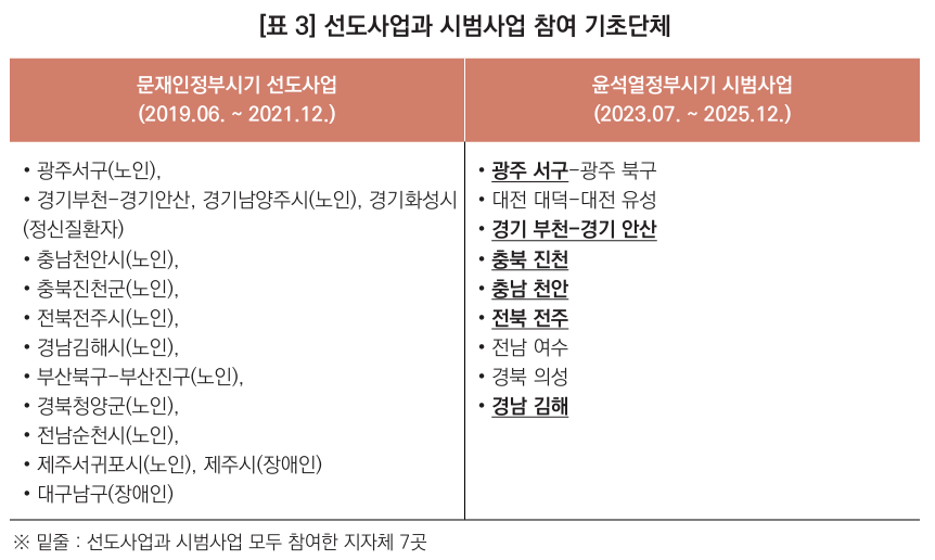 윤석열 정부시기에는 시범사업이 집행되었다. 3년간 총예산을 182억원을 투입하여 기초단체 12개가 참여하였다. 주요 정책대상은 요양병원 입원 경계선상에 있는 75 세 이상 노인으로 제한하여 앞서 문재인정부의 선도사업에 비해 그 성과가 미미하다는 평가가 많았다.7) 윤석열 정부가 적극적으로 추진했던 ‘사회서비스 고도화’정책8) 과 충돌을 일으킨 탓이 큰 것으로 해석되었다. 하지만 지자체별로 자율적 기획 집행 과정에서 많은 모범사례를 남겼다.