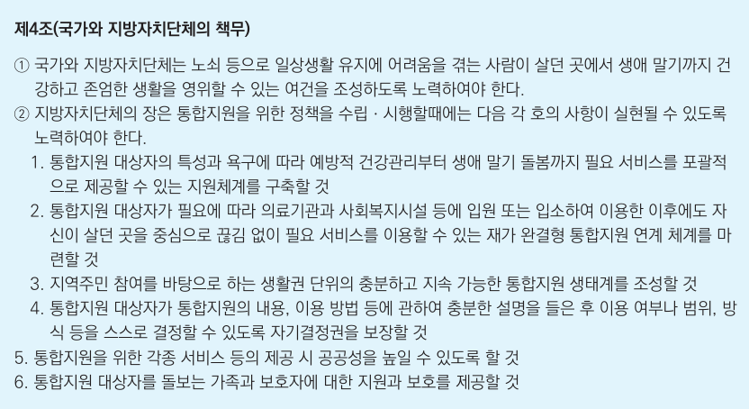 가. 지방자치단체는 보건의료와 요양ㆍ돌봄서비스의 통합 제공, 선택권 보장, 가 족ㆍ보호자에대한 지원ㆍ보호및 주민참여 활성화 등에 대한 책무를 지고, 국가는 이 에 대한 행정적ㆍ재정적지원을 해야 함(제4조).