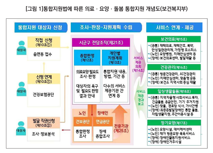일상생활에 어려움을 겪는 노인, 장애인 등이 자신이 살던 곳에서 건강하고 자립적 인 생활을 유지할 수 있도록 보건의료, 요양 등 돌봄 지원을 통합적으로 제공하기 위 한 제도적 기반을 마련한다.