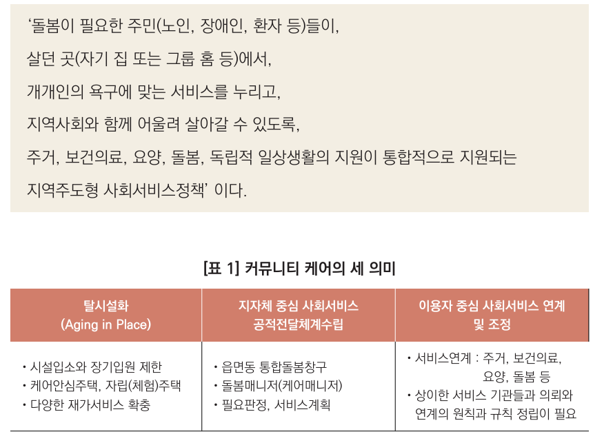 지난 10여 년간 한국의 지역사회 돌봄 정책은 시설 중심에서 살던 곳 중심(Aging in Place)으로 패러다임을 전환해 왔다. 지역사회 통합돌봄은 노인, 장애인 등 돌봄이 필요한 주민이 평소 살던 곳에서 개개인의 욕구에 맞는 주거, 보건의료, 요양, 돌봄 서비스를 통합적으로 지원받는 지역주도형 사회서비스 정책으로 정의된다. 또한 공 급기관과 사업별로 분절적으로 운영되고 있는 다양한 돌봄 서비스를 통합‧연계 제공하는 체계 마련이 필요하다1)는 문제의식에서 출발하였다.