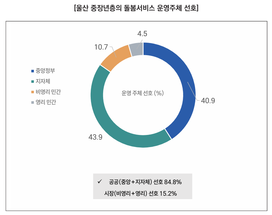 울산 지역 중장년층은 돌봄서비스의 운영 주체로서 정부와 지자체를 명확히 선호하 며, 특히 노인돌봄ㆍ중ㆍ장기 돌봄 수요가 확대될수록 이러한 공공책임 인식은 더욱 강화되는 경향을 보인다. 이는 울산형 통합돌봄 정책이 민간 의존 확대보다는 공공 주도ㆍ지방정부 중심의 책임 구조를 명확히 하고, 비영리ㆍ민간 영역은 보조적 파트 너로 재정립하는 방향이 사회적 인식과 부합함을 시사한다.