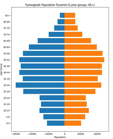 평택시 총인구수는 607,435명(남 318,534명, 여 288,901명)이며 평균연 령은 41.7세로, 청ㆍ장년층 인구 비중이 높은 산업도시형 특징을 보인다. 20~40 대 청ㆍ장년층 인구가 두터운 것은 평택 시가 산업단지와 대기업 사업장 등을 기 반으로 한 고용 유입형 도시라는 점과 관련이 깊다. 특히 평택시 제조업 일자 리는 최근 3년간 경기도에서 가장 많이 증가했으며, 2024년 하반기 제조업 일 자리는 2021년 하반기 대비 1만 3,300 개 늘었다. 삼성전자 평택캠퍼스, 반도체ㆍ자동차 전장부품기업, 신재생에너지 산업 확대는 지역 인구구조가 외부 유입에 크게 의존하고 있음을 보여준다. 평택은 도농복합지역으로, 산업단지 인근지역은 20~40대 생산연령층 비중이 높고, 평택평야를 포함한 농촌지역은 65세 이상 노인인구 비중이 높은 특성을 보인다. 65세 이상 고령층은 점진적으로 증가하고 있으며, 고령층 내부에서는 여성 비중이 우세하다. 특히 75세 이상, 85세 이상 구간에서 여성 인구가 남성 인구를 크게 상회 한다. 이는 지역의 성별 불균형, 돌봄 부담의 성별 편중, 가족 형성 구조에도 영향을 미칠 수 있는 요인이므로, 지역 돌봄 정책과 공공서비스 설계에서 중요한 고려 요소 가 된다.