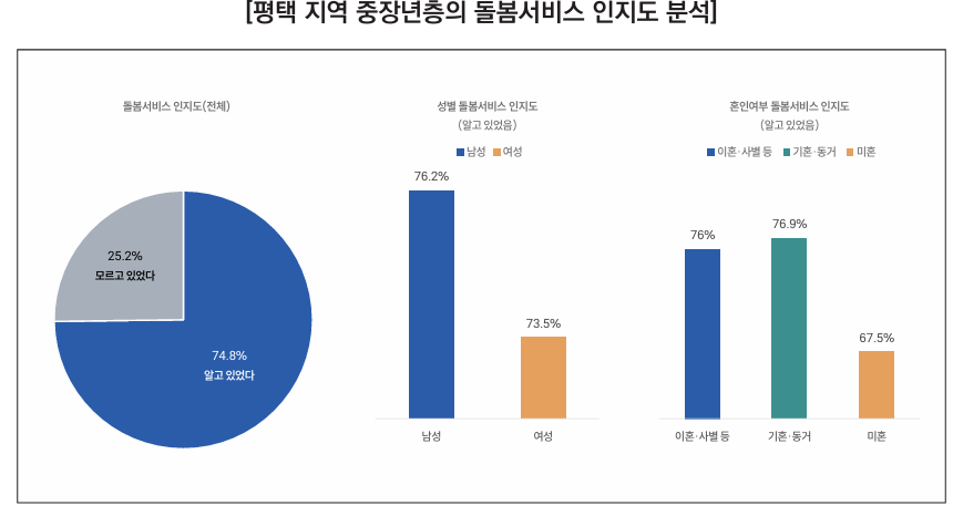 국가 및 지방자치단체가 제공하는 노인돌봄ㆍ장애인돌봄ㆍ영유아돌봄 등 공적 돌봄 서비스에 대한 인식을 조사한 결과, 평택시 전체 응답자의 74.8%가 해당 서비스에 대해 ‘알고 있었다’고 응답해, 돌봄서비스에 대한 사전 인지 수준이 전반적으로 비교 적 높은 편으로 나타났다.
