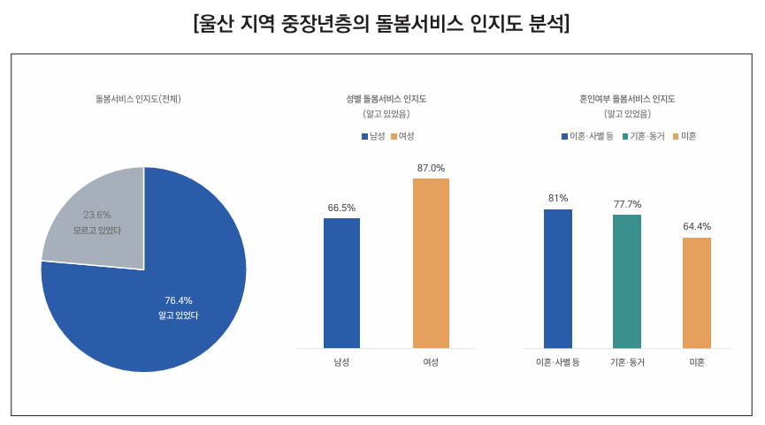울산 지역 중장년층(35~64세)을 대상으로 한 조사 결과, 돌봄서비스를 ‘알고 있었 다’고 응답한 비율은 전체의 76.4%로 나타나 돌봄 정책에 대한 전반적인 인지도는 비교적 높은 수준으로 평가된다. 다만 세부 집단별로는 인식 격차가 뚜렷하게 확인 된다.