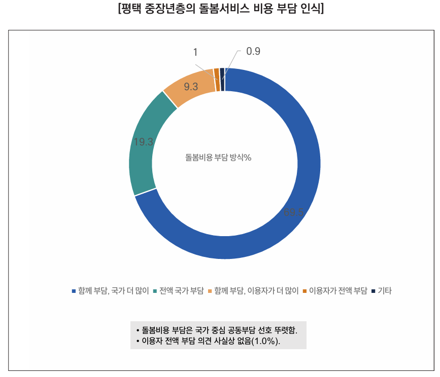 특히 돌봄이 필요한 가족 또는 동거인이 있는 경우 국가 중심 공동부담 선호는 70.5%로 전체 평균을 크게 상회하며, 전액 국가 부담 응답은 오히려 낮게 나타난다. 이는 실제 돌봄을 경험한 집단일수록 재정의 지속성과 제도의 안정성을 중시하며 현 실적인 국가 책임 확대 방식을 선호하고 있음을 의미한다.