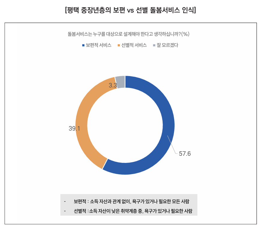 울산 지역 중장년층은 돌봄서비스를 원칙적으로는 보편적 공공 서비스로 설계해야 한다는 인식이 우세하되, 연령ㆍ노동시간ㆍ가구구성에 따라 선별적 접근의 필요성 을 동시에 인식하고 있다.