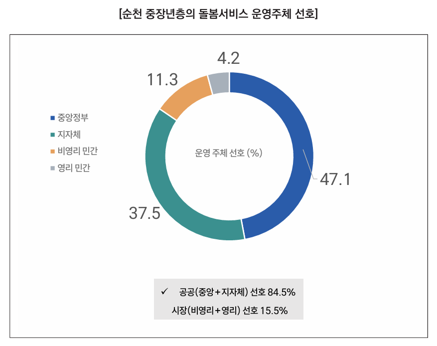 순천시 중장년층을 대상으로 돌봄서비스의 적절한 제공 주체에 대한 인식을 조사한 결과, 정부가 제공해야 한다는 응답이 47.1%로 가장 높았고, 그 다음으로 지방자치 단체 37.5%, 비영리 민간기관 11.3%, 영리 민간기관 4.2% 순으로 나타났다. 이는 돌봄서비스를 시장보다는 공공의 책임 영역으로 인식하는 경향이 매우 강함을 보여 주며, 특히 중앙정부와 지방정부가 공동으로 책임을 져야 한다는 인식이 광범위하게 형성되어 있음을 시사한다.