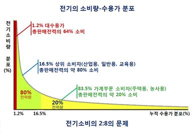 에너지를 많이 쓰는 사람이 더 내야 한다. 한전과 가스공사의 적자를 가정용에서 허리띠를 졸라맬 일이 아니다. 전체 전기소비자의 1.2%가 전체 전기의 64%를 사용하고, 불과 30개의 기업이 전체 전기의 14%를 소비한다. 16.5%의 상위소비자가 약 80%의 전기를 쓰고, 가정을 포함한 83.5%의 소비자가 약 20%의 전기를 사용한다.(홍준희 외, 2019) 경제성장을 위해 ‘기업 하기 좋은 나라’를 만들었으나 기업은 이윤을 다수의 국민에게 환원하지 않고 있다.