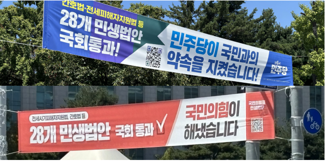 지난 8월28일 일명 구하라법·간호법·전세사기특별법 등 현안을 포함한 28개 법안이 민주당·국민의힘 양당합의로 국회본회의를 통과했다. 이날 본회의 처리는 22대 국회가 윤석열대통령의 거부권 남발로 정치적 교착상태에 빠졌지만 쟁점이 없는 민생법안 만큼은 서둘러 합의처리하자는 공감대에서 비롯되었다. 민주당과 국민의힘은 본회의 처리 직후 약속이나 한 듯 똑같은 문구의 현수막을 전국 곳곳에 걸어 각자 자신들의 성과로 자랑했다.