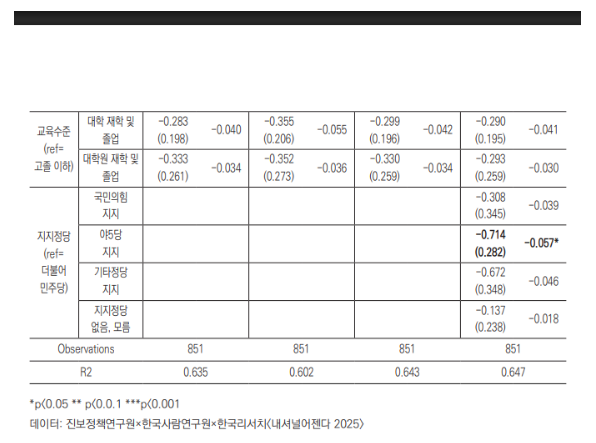 더불어 네 모델에서 모두 이념 성향이 보수적일수록 부정선거 음모론 신뢰도에 정적 영향을 미치고 있어, 정치적으로 보수적일수록 부정선거 음모론 신뢰도가 높아지는 것으로 확인된다. 다만 모델4에서 이념 성향 변수의 계수 값이 =0.066으로 나타나 그 영향력은 정서적 양극화에 비해 크지 않다.