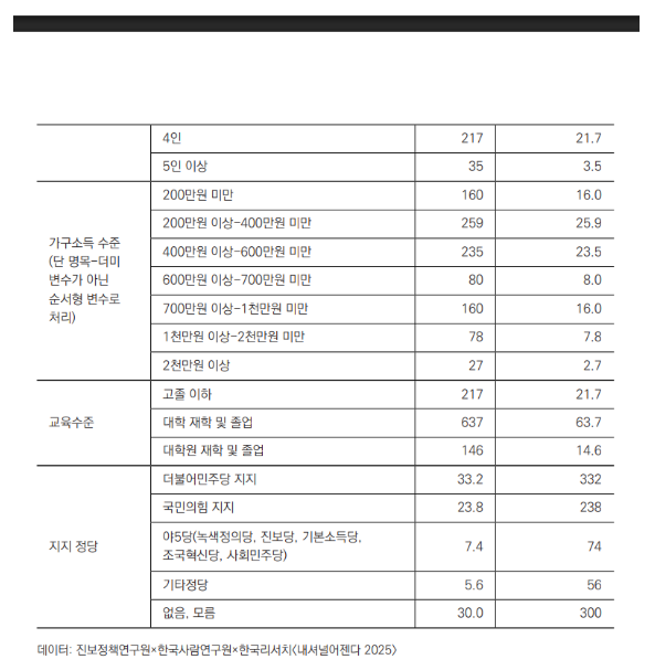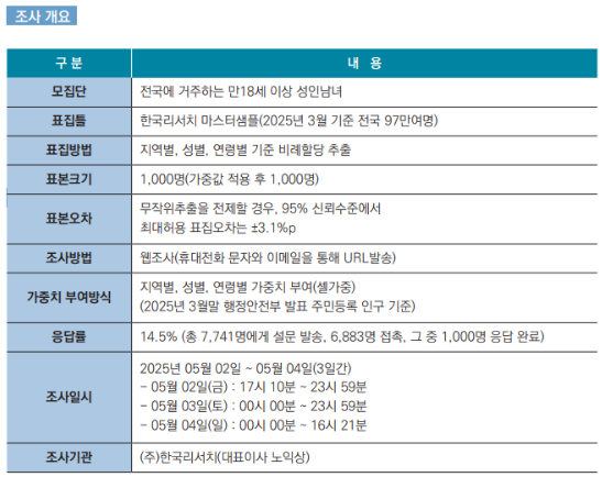 분석자료는 2025 내셔널어젠다 조사 데이터를 활용한다. 해당 조사는 지난 5월 2일부터 5월 4일까지 한국리서치의 마스터 샘플을 표집틀로 하여 전국에 거주하는 만 18세 이상 성인남녀를 대상으로 실시되었다.