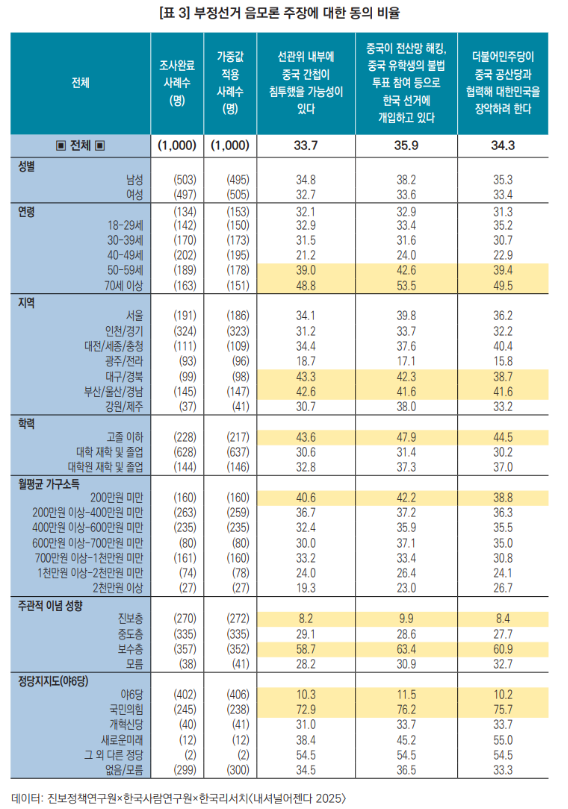 먼저 연령, 성별, 지지정당 등 주요 변수에 따른, 각 음모론 주장에 대한 동의 비율을 [표 3]에서 살펴보면 다음과 같다. 전체적으로 부정선거 음모론에 동의하는 비율은 35% 내외로 나타나고 있다. 성별에 따라서는 여성(33.6%)보다 남성(38.2%)이 부정선거 음모론을 신뢰하고 있었으며, 연령대별로는 60대 이상에서 부정선거 음모론에 대한 동의 비율이 높은 것이 확인되었다. 지역별로는 광주/전라에 비해 대구/경북 지역과 부산/울산/경남 지역에서 부정선거 주장에 대한 동의 정도가 높았다. 학력별로는 고졸 이하에서 약 45%가량이 부정선거 음모론에 동의하고 있었고, 가구소득에 따른 구분을 확인하였을 때에는 200만원 미만의 저소득층이 약 40%로 높은 음모론 동의 비율을 보였다. 주관적 이념 성향 구분을 보면 진보층(약 9%)보다 보수층(약 60%)에서 음모론에 대한 높은 동의 비율이 확인된다. 마지막으로, 특히 정당지지도에 따른 구분이 가장 극단적인 양상으로 나타나는데, 야6당(민주당, 조국혁신당, 진보당, 기본소득당, 사회민주당, 민주노동당) 지지자들은 약 10% 가량이 부정선거 음모론에 동의하는 반면, 국민의힘 지지자는 약 75%가 부정선거 음모론에 동의하고 있었다.