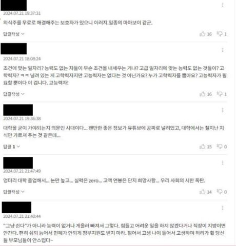 관련 기사에 ‘집에서 쫓아내고 밥은 절대 주지말고…’, ‘말이 대졸자들이지ᆢ대졸 실력 안되서 취직 못 하는것도 원인일 듯. 대학 졸업장 남발하다 보니ᆢ’, ‘"그냥 쉰다"가 아니라 능력이 없거나 게을러 빠져서 그렇다. 힘들고 어려운 일을 하지 않겠다거나 직장이 지방이면 안간다.’는 댓글들이 달렸다. 해당 보도들을 근거로 각종 커뮤니티와 SNS에서도 비슷한 반응들이 이어졌다.