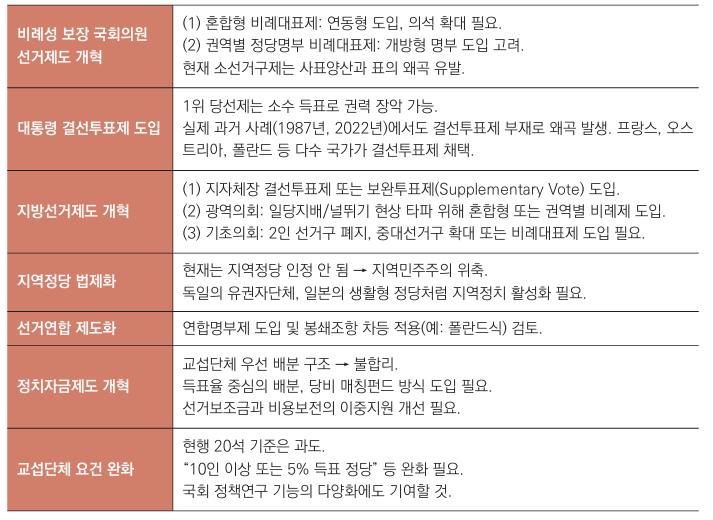 셋째, 개헌 논의는 별도 트랙에서 진행되어야 하며, 선거제도 개편과 함께 논의될 경우 정치개혁의 동력이 약화될 위험이 있다.