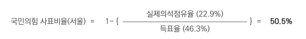 하지만 현 시점에서 위 정치개혁 과제를 모두 동시에 실현하기는 어렵다. 게다가 표 의 등가성(비례성) 보장이라는 문제제기 안에 당파성이 있을리 없다. 예컨대 지난 총 선결과를 보면 서울에서 <국민의힘> 후보들의 득표율 평균은 46.3%인데 당선자는 22.9%에 불과했다. <국민의힘>이 서울에서 얻은 총 득표 중 약 23.1%p는 의석으로 전혀 연결되지 못했으므로, 사표로 처리된 표의 비율은 약 50.5%라고 할 수 있다. 서울시민 중 <국민의힘>을 선택한 표 중 절반이 넘게 사표가 된 것이다. <국민의힘> 이야말로 표의 등가성(비례성)을 주장해야할 뚜렷한 동기와 명분이 있는 것이다. 따라서 완전한 비례성 즉 득표율과 의석률의 비례성을 강화하자는 주장은 오히려 양당제를 고착시킬 수 있으며 국민의힘에게 회생의 기회를 줄 수 있다. 내란종식과 사회 대개혁을 위한 당면 정세의 요구에 부합하지 않을 수 있다.