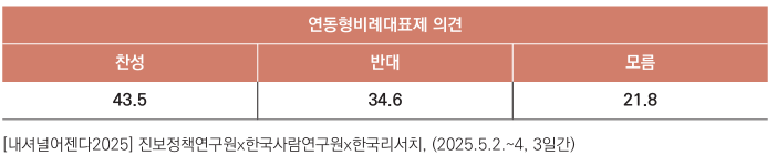 이같은 현실은 다당제 연합정치를 진보정치의 생존전략으로 국한하기보다, 민주주의의 지속가능성과 보수정치의 재구성을 위한 전략으로 재정의할 것을 요구한다. 내란정당이 독자적인 지역 기반과 양당 구조 속의 독점적 위치를 통해 여전히 일정 지분을 유지할 수 있는 상황에서, 다당제는 헌정파괴 세력의 고립과 합리적 보수의 재편을 가능케 하는 제도적 토대이다. 이는 하승수가 지적한 바와 같이 극단주의 정치 세력을 제도적으로 고립시키고, 정책 중심의 다원적 정치경쟁을 촉진하기 위한 “정치적 봉쇄전략”이자 “제도개혁 전략”이다.6) 다당제에 대한 국민여론도 매우 높게 형성되어있다. 2017년 문화일보 조사에서 ‘우리나라 정치발전을 위해 어떤 정당 구조가 바람직하다고 생각하나’라는 질문에 대해 65.0%의 응답자가 ‘국민의 다양한 의견을 반영할 수 있는 다당제’라고 답변했다. ‘정치 안정을 도모할 수 있는 양당제’를 꼽은 비율은 29.4%에 불과했다. 2019년 MBC 여론조사에서 두 제도의 ‘선호’를 묻는 질문에 ‘다당제 선호’는 55%로 다소 줄어들었지만 ‘양당제 선호’는 31.3%로 2년 전 문화일보 조사결과와 큰 차이가 없었다. 2023년 뉴스토마토의 여론조사에서는 전체 응답자의 52.3%가 ‘다당제 구도를 선호한다’고 응답했고 ‘양당제 구도를 선호한다’는 응답자는 27.7%로 오히려 줄었다. 설문 문항과 조사시점에 따라 다소 차이가 났지만 다당제에 대한 국민여론은 ‘선호’에 크게 기울어 있음을 알 수 있다.7) 진보정책연구원이 지난 5월 한국사람연구원, 한국리서치와 공동으로 수행한 프로젝트 [내셔널어젠다 2025]에 따르면 2020년 총선에서 처음 실시된 현행 연동형 비례 대표제에 대해서도 응답자의 43.5%가 찬성의견을 보여 반대의견 34.6%보다 높게 나타났다. 특히 당시 야6당(민주당, 조국혁신당, 진보당, 기본소득당, 사회민주당, 정의당) 지지자들 중 60.2%가 찬성의견을, 국민의힘 지지자들은 29.3%를 보여 연 동형 비례제는 민주진보진영의 주요 담론으로 자리잡았음을 알 수 있다.