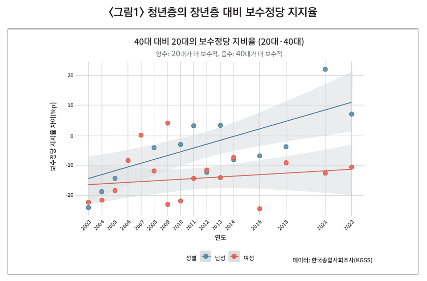 <그림1>은 성균관대 동아시아학술원 서베이리서치센터 한국종합사회조사(Korean General Social Survey, KGSS)를 이용하여 20대 청년층의 보수정당 지지도 추이를 40대 장년층과 대비해서 추적한 것이다. 가로축에서 0 이하면 20대가 40대보다 진보정당을 더 지지한다는 의미고, 0 이상이면 20대가 40대보다 보수정당을 더 지 지한다는 의미다. 진보정당은 민주당, 진보당, 노동당 계열 정당을 모두 포괄하고, 보수 정당은 국민의힘, 친박연대 등의 계열 정당을 모두 포괄한다.